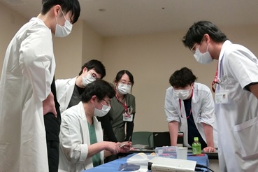 患者役は様々な職種の人が交代で行い、実際に身体診察を行いながらの訓練となりました。 写真は外科の藪内先生を診察している様子です。とても緊張しました。